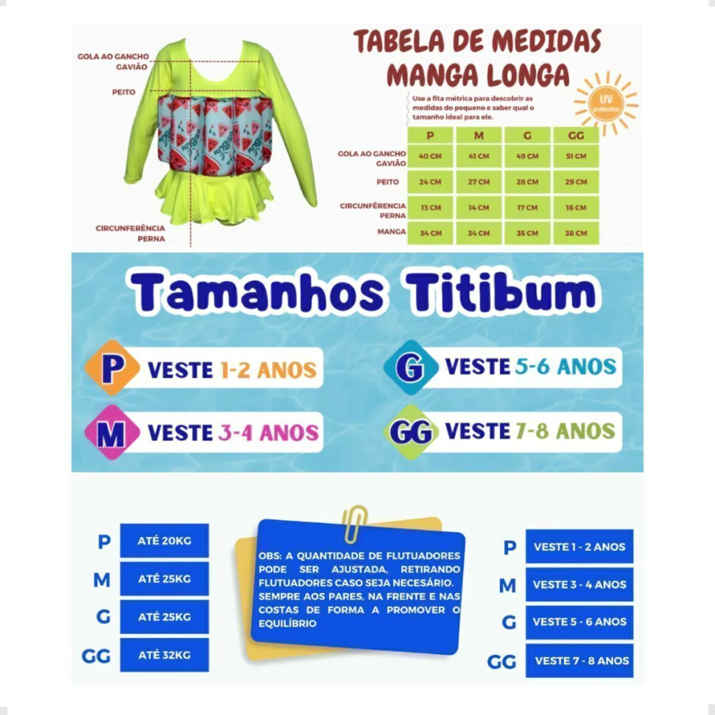 A TITIBUM® é a roupa flutuante essencial para crianças de 1 a 10 anos, garantindo segurança, conforto e liberdade de movimentos durante o aprendizado do nado. Diferente de boias convencionais, não aperta os braços, permitindo uma experiência natural e prazerosa dentro e fora da água.