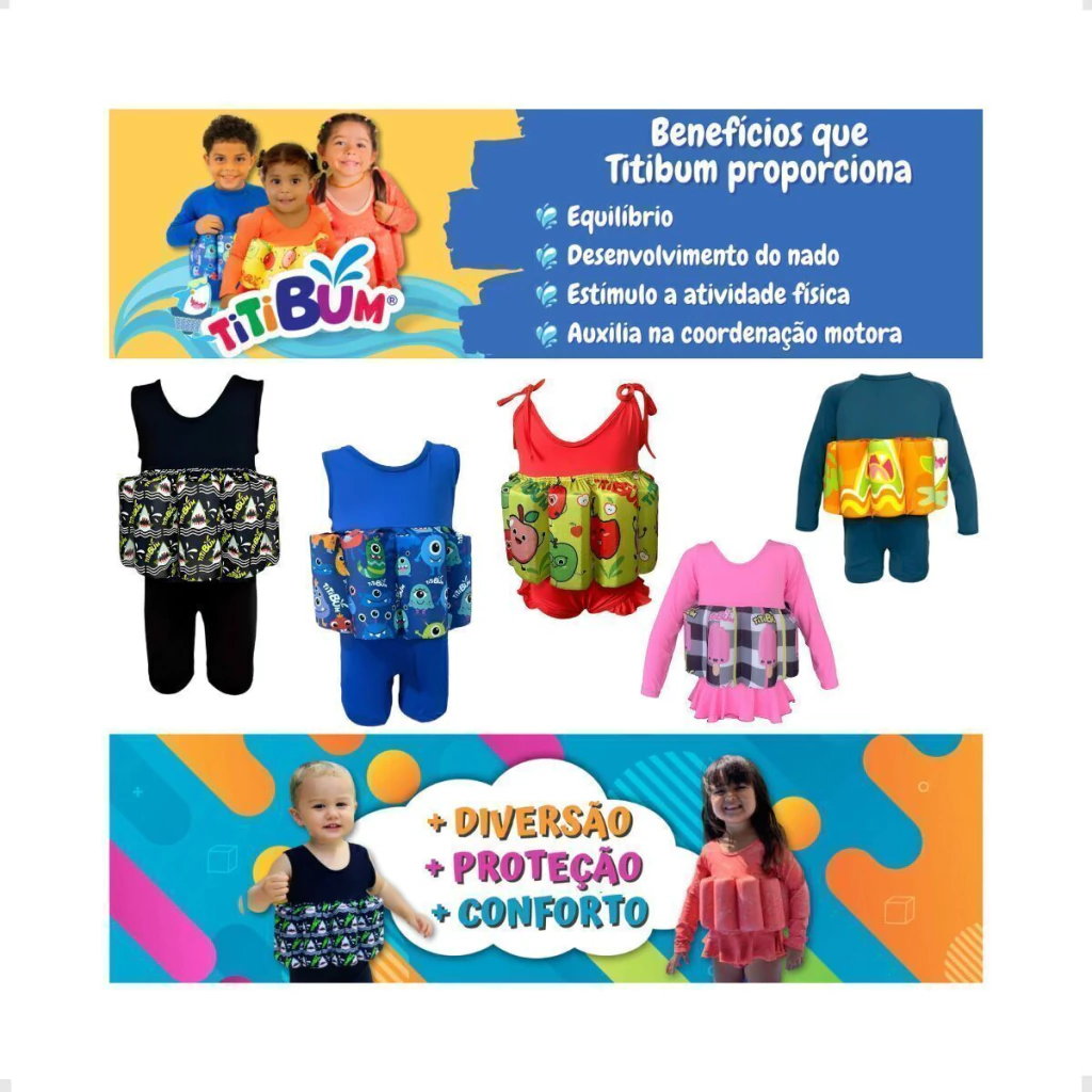 A TITIBUM® é a roupa flutuante essencial para crianças de 1 a 10 anos, garantindo segurança, conforto e liberdade de movimentos durante o aprendizado do nado. Diferente de boias convencionais, não aperta os braços, permitindo uma experiência natural e prazerosa dentro e fora da água.