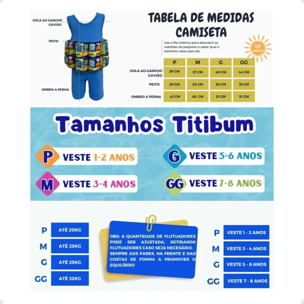 A TITIBUM® é a roupa flutuante essencial para crianças de 1 a 10 anos, garantindo segurança, conforto e liberdade de movimentos durante o aprendizado do nado. Diferente de boias convencionais, não aperta os braços, permitindo uma experiência natural e prazerosa dentro e fora da água.